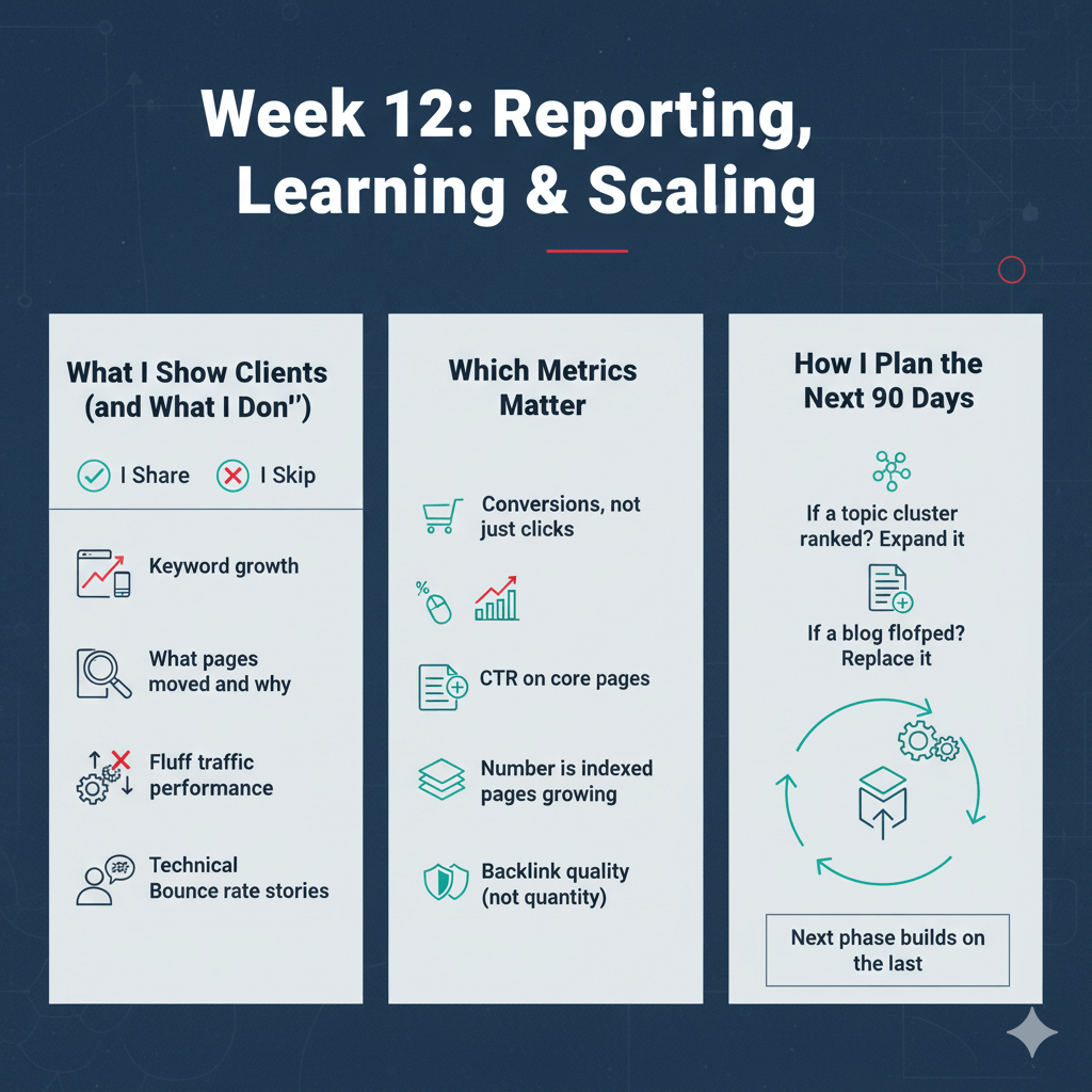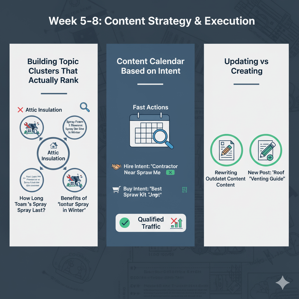 Week 5–8Content StrategyIntent-based blogs, updatesWriting for volume, not intent