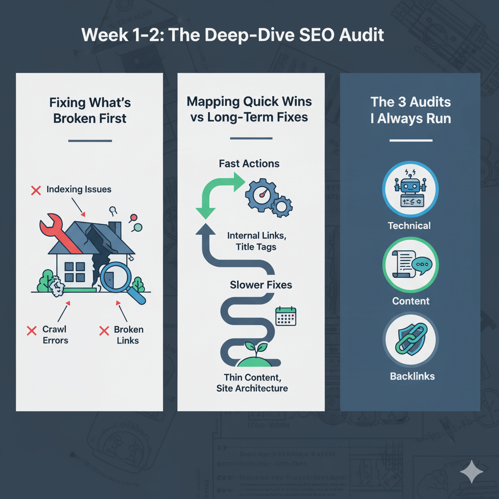 Week 1–2Audit & PrioritizationTechnical, content, backlink auditsTrying to fix everything