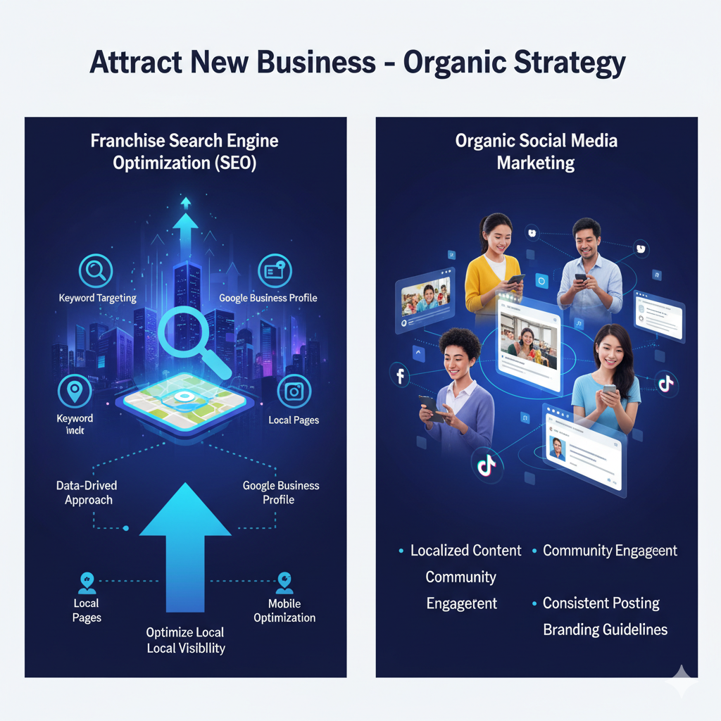 Local Customer Acquisition | Helps franchisees attract and retain local customers through targeted franchise marketing strategies like SEO, social media, and paid ads. Optimizes local marketing efforts while maintaining brand identity. |