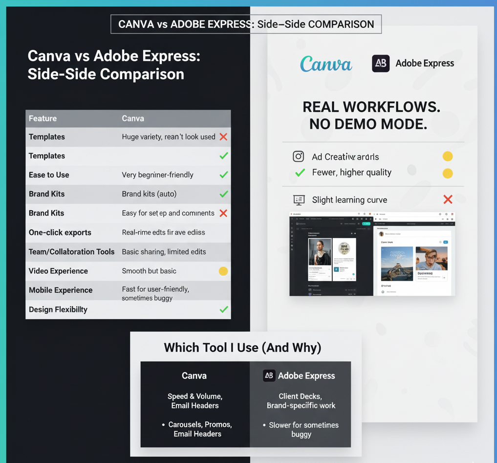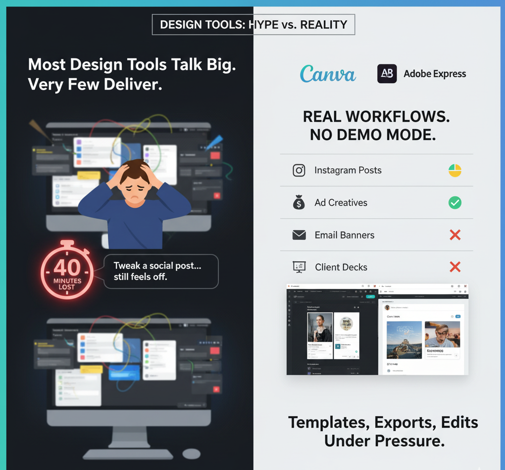 This isn’t a generic comparison filled with marketing jargon. I’ve tested both Canva and Adobe Express inside real workflows not demo mode. Instagram posts. Ad creatives. Email banners. Client decks. Templates, exports, edits under pressure.