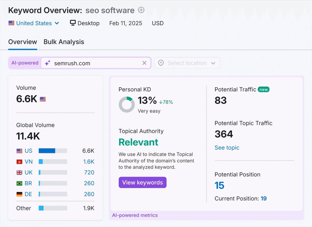 Let’s examine two main indicators as peruse the Semrush keyword database: search volume and keyword difficulty. Search volume informs me on the average monthly number of searches for this term. Semrush Keyword difficulty checker tells how difficult it will be for my site to get good results on this search phrase. Semrush provides overall keyword difficulty rankings. Does more of our own site’s thematic authority give me an AI powered keyword difficulty metric with Semrush keyword suggestion along with this previous step where we entered domain? Any Semrush Keyword Magic Tool or Keyword Overview report includes both numbers.